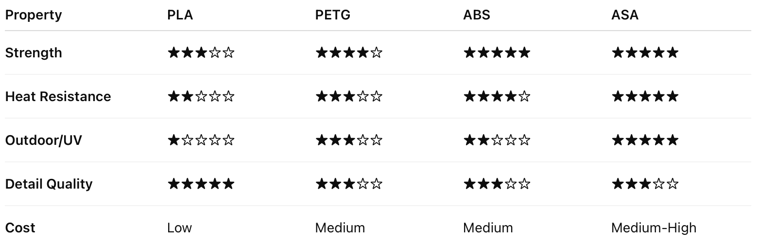 ASA is essentially ABS designed not to fade, crack, or degrade outdoors. For anything exposed to sun, heat, and weather — this is your best choice.